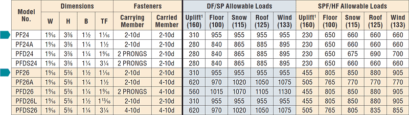 The PF is a top-flange hanger designed for common light-frame applications. This economical hanger is for use with 2x4 and 2x6 members. The double-shear nailing design distributes the load through two points on each joist, providing greater strength with fewer nails.