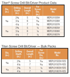 Titen screw drill bits enable predrilling and installation of concrete and masonry screws. The bits work with the Titen installation tool and also with drills with a standard, three-jaw-style chuck. These 3/16" and 5/32"-dia. drill bits are available in 3 1/2", 4 1/2" and 5 1/2" lengths.